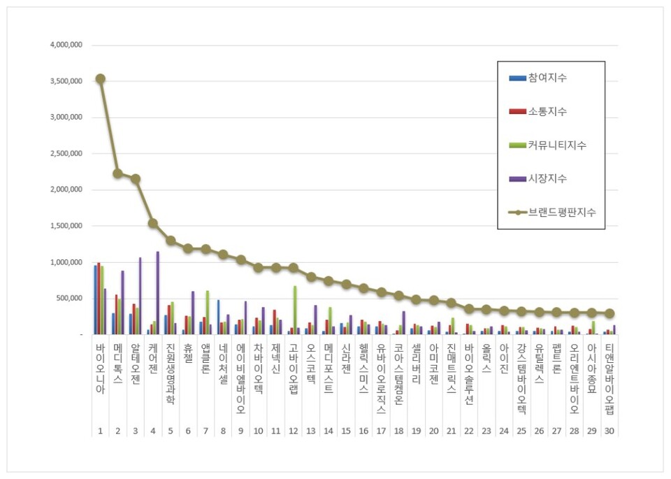 생물공학 상장기업 브랜드평판 분석은 참여지수, 소통지수, 커뮤니티지수, 시장지수로 구분하여 브랜드평판지수를 산출했다.