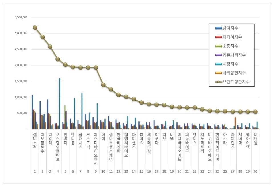 4위, 오스템임플란트 브랜드는 참여지수 177,040 미디어지수 184,519 소통지수 111,357 커뮤니티지수 114,286 시장지수 1,595,171 사회공헌지수 9,048이 되면서 브랜드평판지수 2,191,421로 분석됐다. 지난 5월 브랜드평판지수 1,878,653과 비교해보면 16.65% 상승했다.