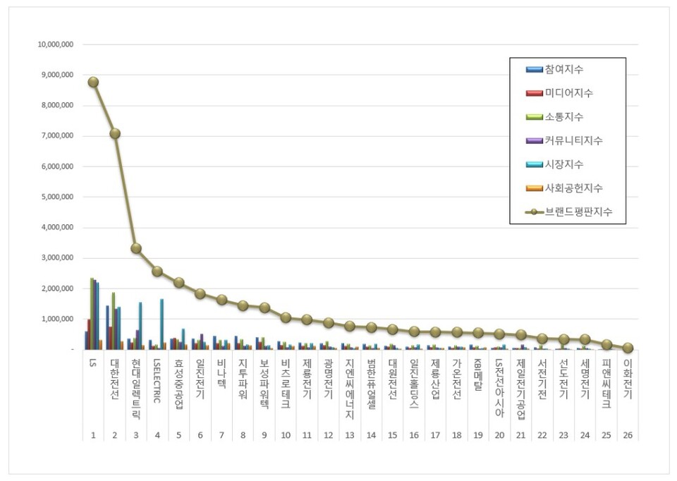 2위, 대한전선 브랜드는 참여지수 1,452,500 미디어지수 760,430 소통지수 1,866,669 커뮤니티지수 1,328,233 시장지수 1,410,377 사회공헌지수 275,120이 되면서 브랜드평판지수 7,093,329로 분석됐다. 지난 5월 브랜드평판지수 9,988,485와 비교해보면 28.98% 하락했다.
