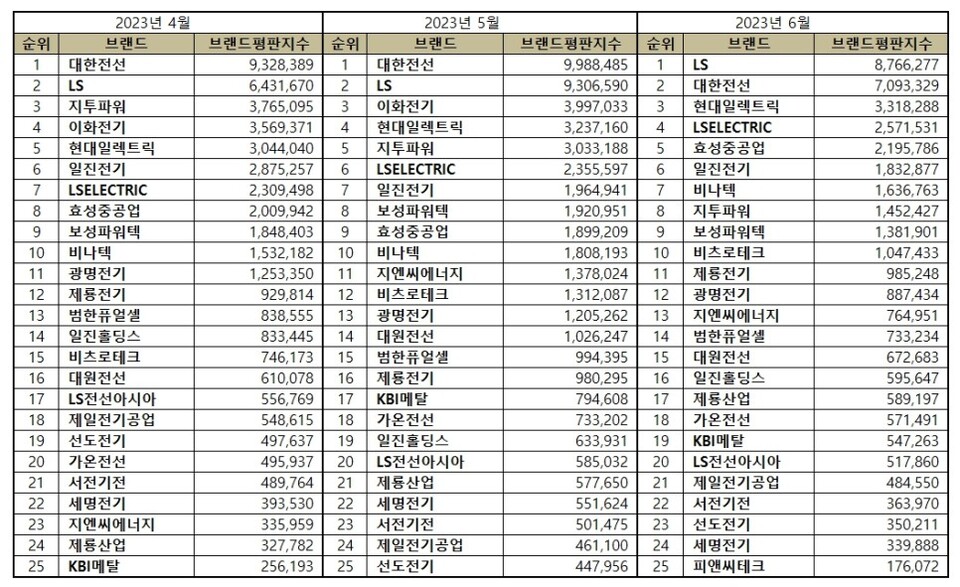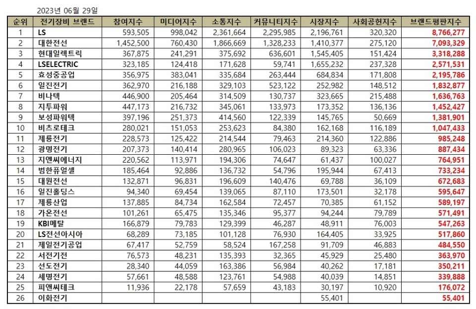 전기장비 상장기업 브랜드평판 2023년 6월 빅데이터 분석 순위는 LS, 대한전선, 현대일렉트릭, LSELECTRIC, 효성중공업, 일진전기, 비나텍, 지투파워, 보성파워텍, 비츠로테크, 제룡전기, 광명전기, 지엔씨에너지, 범한퓨얼셀, 대원전선, 일진홀딩스, 제룡산업, 가온전선, KBI메탈, LS전선아시아, 제일전기공업, 서전기전, 선도전기, 세명전기, 피앤씨테크, 이화전기 순이었다.