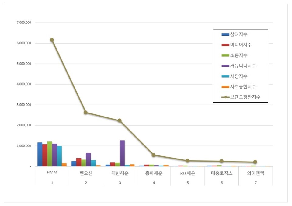 3위, 대한해운 브랜드는 참여지수 88,995 미디어지수 197,073 소통지수 174,208 커뮤니티지수 1,278,522 시장지수 73,292 사회공헌지수 112,166이 되면서 브랜드평판지수 2,224,256으로 분석됐다. 지난 5월 브랜드평판지수 1,649,488과 비교해보면 34.85% 상승했다.