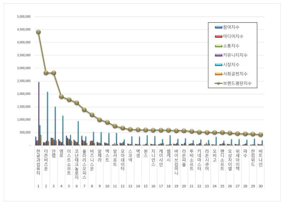 소프트웨어 상장기업 브랜드평판 1위를 기록한 한글과컴퓨터 브랜드는 참여지수 341,530 미디어지수 187,243 소통지수 205,288 커뮤니티지수 2,460,900 시장지수 792,344 사회공헌지수 421,618이 되면서 브랜드평판지수 4,408,924로 분석됐다. 지난 5월 브랜드평판지수 5,442,782와 비교해보면 19.00% 하락했다.