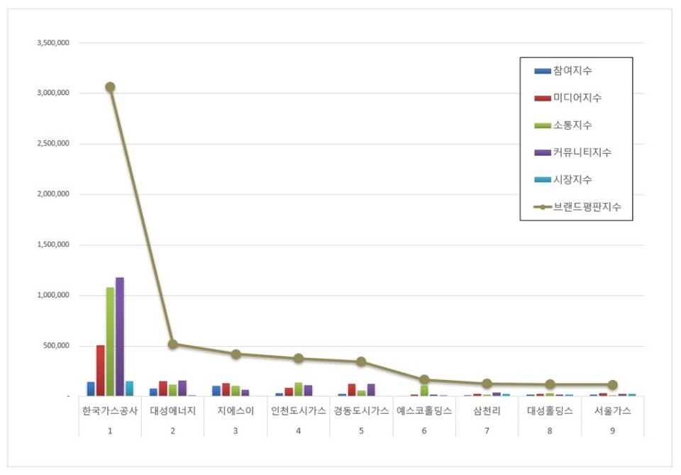 1위, 한국가스공사 브랜드는 참여지수 142,364 미디어지수 509,829 소통지수 1,079,954 커뮤니티지수 1,179,099 시장지수 154,532가 되면서 브랜드평판지수 3,065,779로 분석됐다. 지난 6월 브랜드평판지수 3,095,762와 비교해보면 0.97% 하락했다.