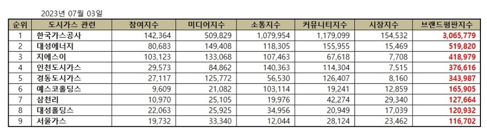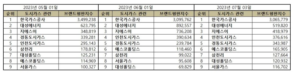 이넷뉴스 = 2023년 7월 도시가스 상장기업 브랜드평판이 공개됐다.