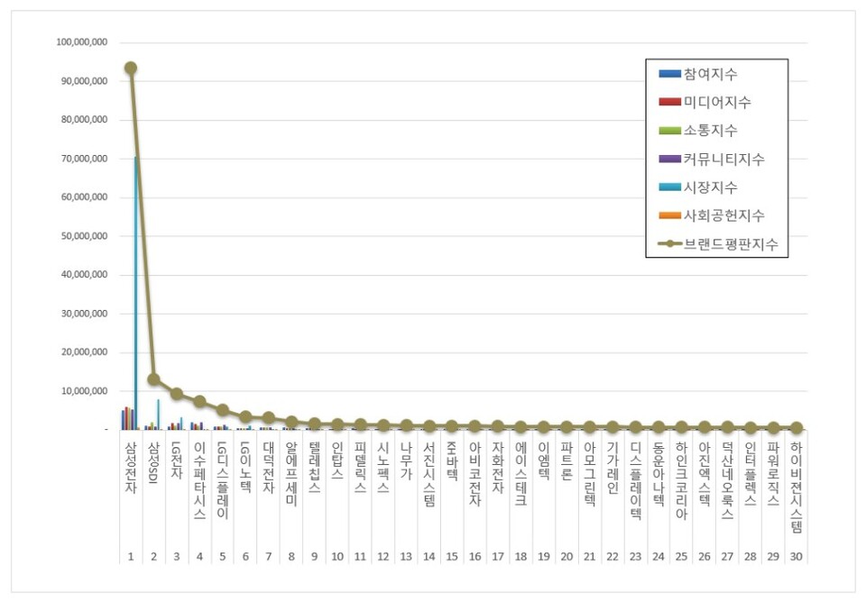 3위, LG전자 브랜드는 참여지수 1,011,499 미디어지수 1,860,558 소통지수 1,235,992 커뮤니티지수 1,721,813 시장지수 3,409,866 사회공헌지수 135,328이 되면서 브랜드평판지수 9,375,056으로 분석됐다. 지난 6월 브랜드평판지수 4,150,024와 비교해보면 125.90% 상승했다.