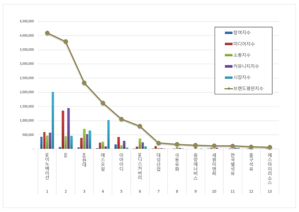 4위, 에스오일 브랜드는 참여지수 33,035 미디어지수 224,046 소통지수 258,029 커뮤니티지수 89,645 시장지수 1,025,470이 되면서 브랜드평판지수 1,630,226으로 분석됐다. 지난 6월 브랜드평판지수 1,498,391과 비교해보면 8.80% 상승했다.