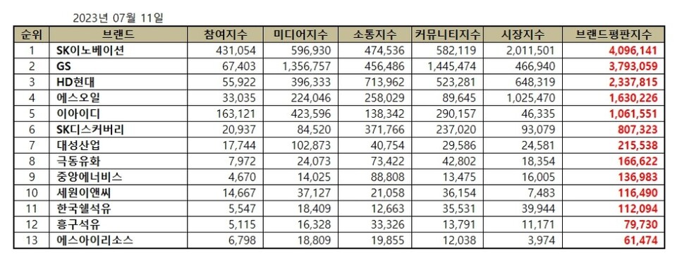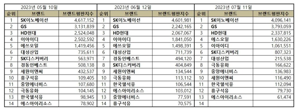 2023년 7월 석유가스 상장기업 브랜드평판 순위는 SK이노베이션, GS, HD현대, 에스오일, 이아이디, SK디스커버리, 대성산업, 극동유화, 중앙에너비스, 세원이앤씨, 한국쉘석유, 흥구석유, 에스아이리소스 순으로 분석됐다.