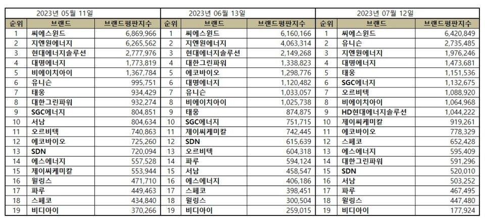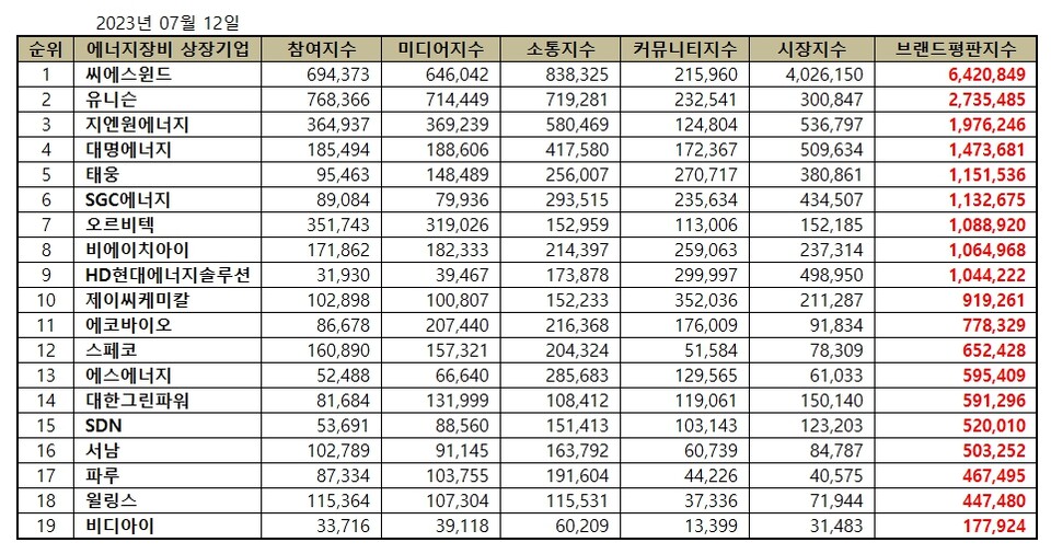 2023년 7월 에너지장비 상장기업 브랜드평판 빅데이터 분석 순위는 씨에스윈드, 유니슨, 지엔원에너지, 대명에너지, 태웅, SGC에너지, 오르비텍, 비에이치아이, HD현대에너지솔루션, 제이씨케미칼, 에코바이오, 스페코, 에스에너지, 대한그린파워, SDN, 서남, 파루, 윌링스, 비디아이 순이었다.