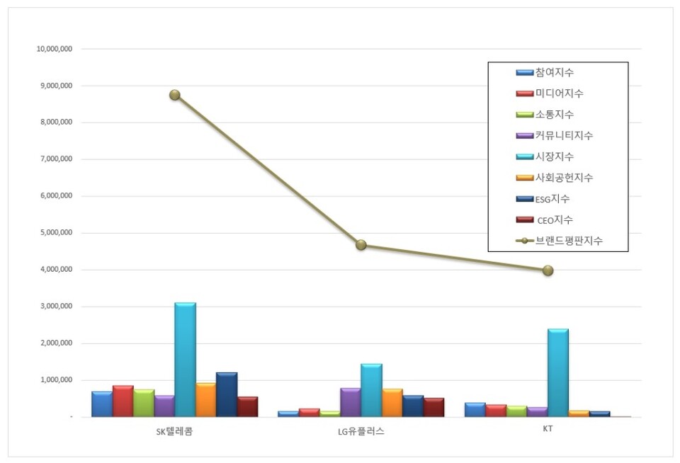 3위, KT 브랜드는 참여지수 383,184 미디어지수 326,805 소통지수 302,984 커뮤니티지수 256,738 시장지수 2,381,389 사회공헌지수 174,455 ESG지수 155,354 CEO지수 3,396이 되면서 브랜드평판지수 3,984,304로 분석됐다. 지난 6월 브랜드평판지수 4,359,330과 비교해보면 8.60% 하락했다.