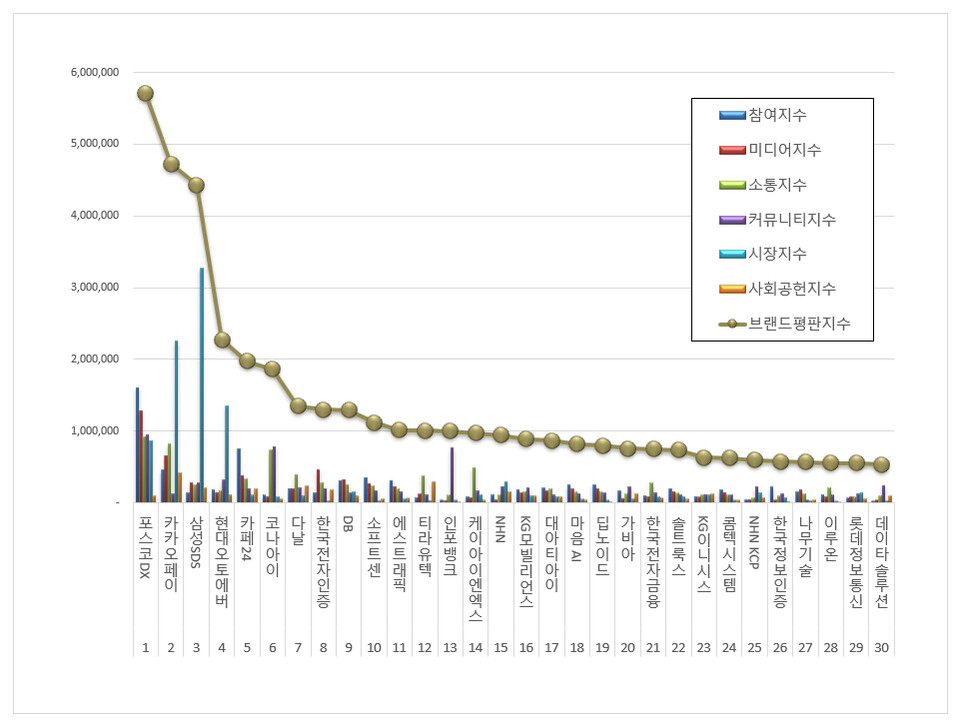 IT서비스 상장기업 브랜드평판 1위를 기록한 포스코DX 브랜드는 참여지수 1,602,545 미디어지수 1,276,903 소통지수 920,633 커뮤니티지수 947,672 시장지수 858,540 사회공헌지수 97,539가 되면서 브랜드평판지수 5,703,832로 분석됐다. 지난 6월 브랜드평판지수 3,435,276과 비교해보면 66.04% 상승했다.