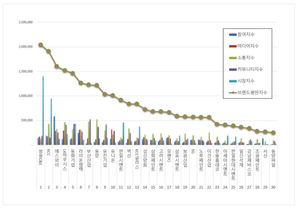 건축자재 상장기업 브랜드평판 2023년 7월 빅데이터 분석 30위 순위는 쌍용C&E, KCC, 에스와이, LX하우시스, 동화기업, 라이온켐텍, 부산산업, 동양, 유진기업, 유니온, 한일시멘트, 벽산, KCC글라스, 성신양회, 삼화페인트, 고려시멘트, 모헨즈, 삼표시멘트, 보광산업, SG, 노루페인트, 이건산업, 한솔홈데코, 아세아시멘트, 한일현대시멘트, 일신석재, 강남제비스코, 조광페인트, 서산, 동양파일 순이었다.