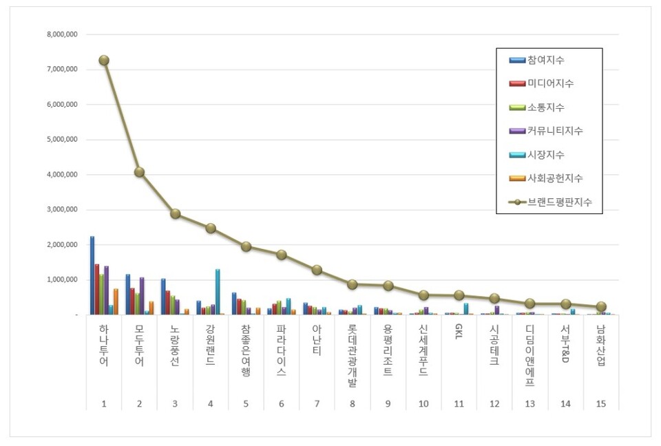 2위, 모두투어 브랜드는 참여지수 1,154,304 미디어지수 755,280 소통지수 616,619 커뮤니티지수 1,073,194 시장지수 107,724 사회공헌지수 374,145가 되면서 브랜드평판지수 4,081,266으로 분석됐다. 지난 6월 브랜드평판지수 3,813,285와 비교해보면 7.03% 상승했다.