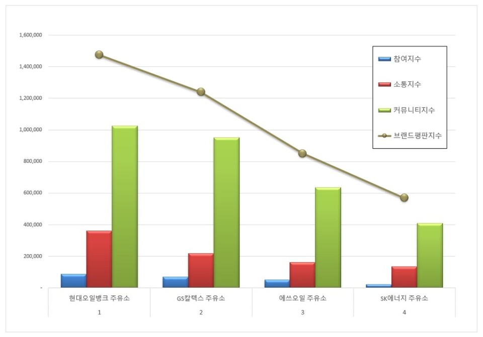 1위, 현대오일뱅크 주유소 브랜드는 참여지수 88,342 소통지수 361,411 커뮤니티지수 1,024,688이 되면서 브랜드평판지수 1,474,441로 분석됐다. 지난 6월 브랜드평판지수 1,416,231과 비교해보면 4.11% 상승했다.