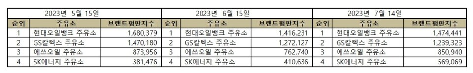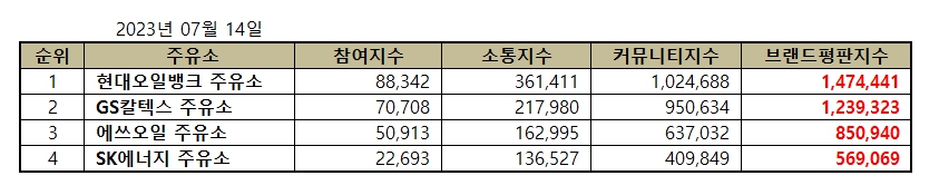 이넷뉴스와 한국기업평판연구소는 소비자들에게 사랑받는 주유소 브랜드에 대해 브랜드 빅데이터를 통한 평판조사를 하였다. 4개 주유소 브랜드평판 분석은 2023년 6월 14일부터 2023년 7월 14일까지의 주유소 브랜드 빅데이터 4,133,772개를 분석하여 소비자들의 브랜드 습관과 브랜드와 관계 분석을 통해 브랜드평판을 분석했다. 지난 6월 브랜드 빅데이터 3,861,734개와 비교하면 7.04% 증가했다.