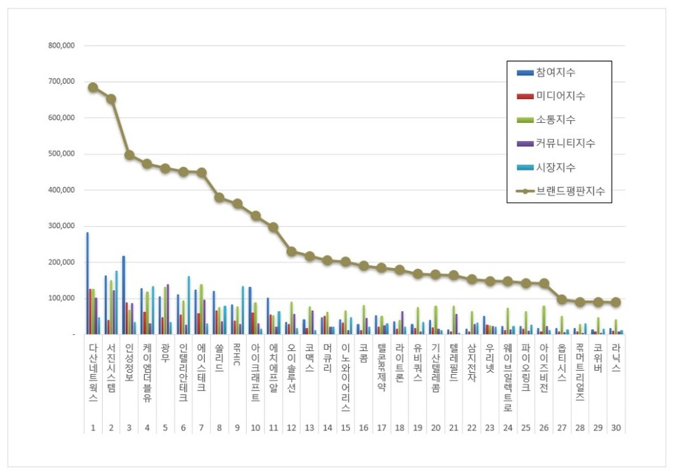 3위, 인성정보 브랜드는 참여지수 218,435 미디어지수 88,999 소통지수 68,301 커뮤니티지수 86,972 시장지수 35,106이 되면서 브랜드평판지수 497,813으로 분석됐다. 지난 6월 브랜드평판지수 636,447과 비교해보면 21.78% 하락했다.