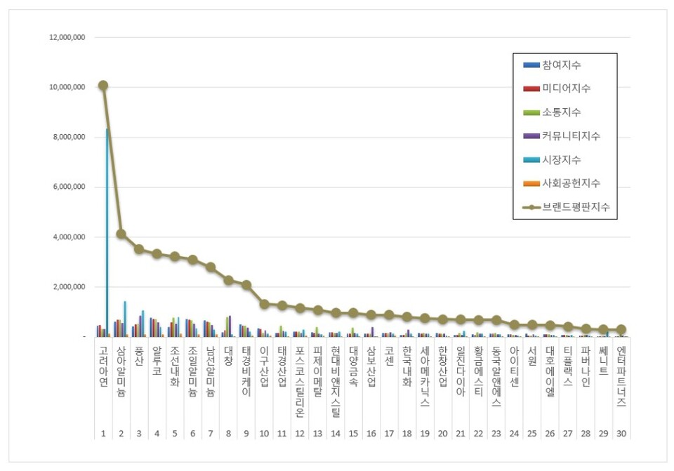 1위, 고려아연 브랜드는 참여지수 468,382 미디어지수 482,801 소통지수 327,470 커뮤니티지수 330,549 시장지수 8,343,438 사회공헌지수 131,798이 되면서 브랜드평판지수 10,084,439로 분석됐다. 지난 6월 브랜드평판지수 10,961,304과 비교해보면 8.00% 하락했다.