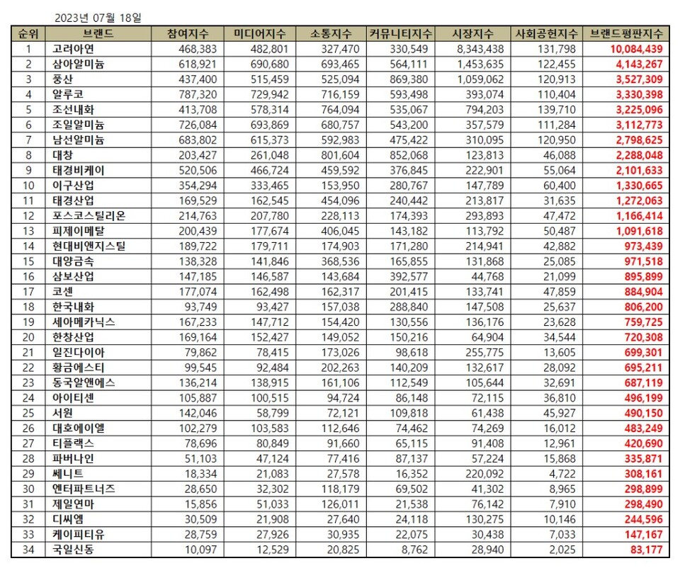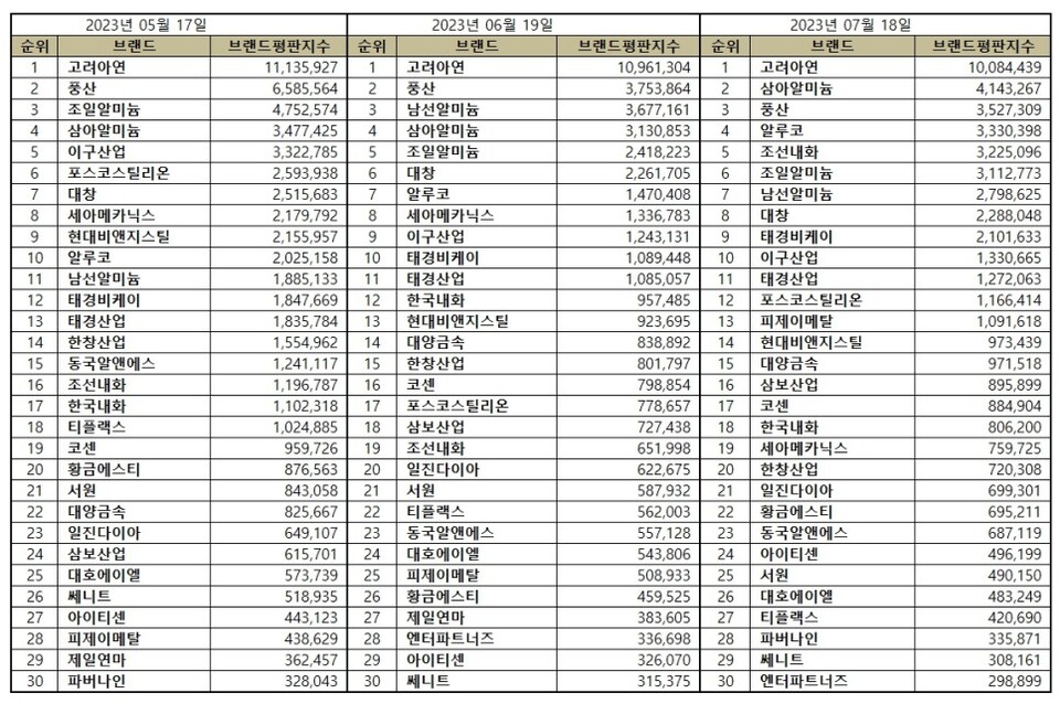 비철금속 상장기업 브랜드평판 2023년 7월 빅데이터 분석 30위 순위는 고려아연, 삼아알미늄, 풍산, 알루코, 조선내화, 조일알미늄, 남선알미늄, 대창, 태경비케이, 이구산업, 태경산업, 포스코스틸리온, 피제이메탈, 현대비앤지스틸, 대양금속, 삼보산업, 코센, 한국내화, 세아메카닉스, 한창산업, 일진다이아, 황금에스티, 동국알앤에스, 아이티센, 서원, 대호에이엘, 티플랙스, 파버나인, 쎄니트, 엔터파트너즈 순이었다.