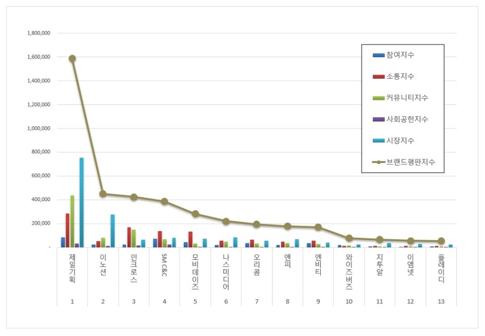 4위, SM C&C 브랜드는 참여지수 72,949 소통지수 138,281 커뮤니티지수 68,809 사회공헌지수 24,028 시장지수 81,965가 되면서 브랜드평판지수 386,031로 분석됐다. 지난 6월 브랜드평판지수 393,332와 비교해보면 1.86% 하락했다.
