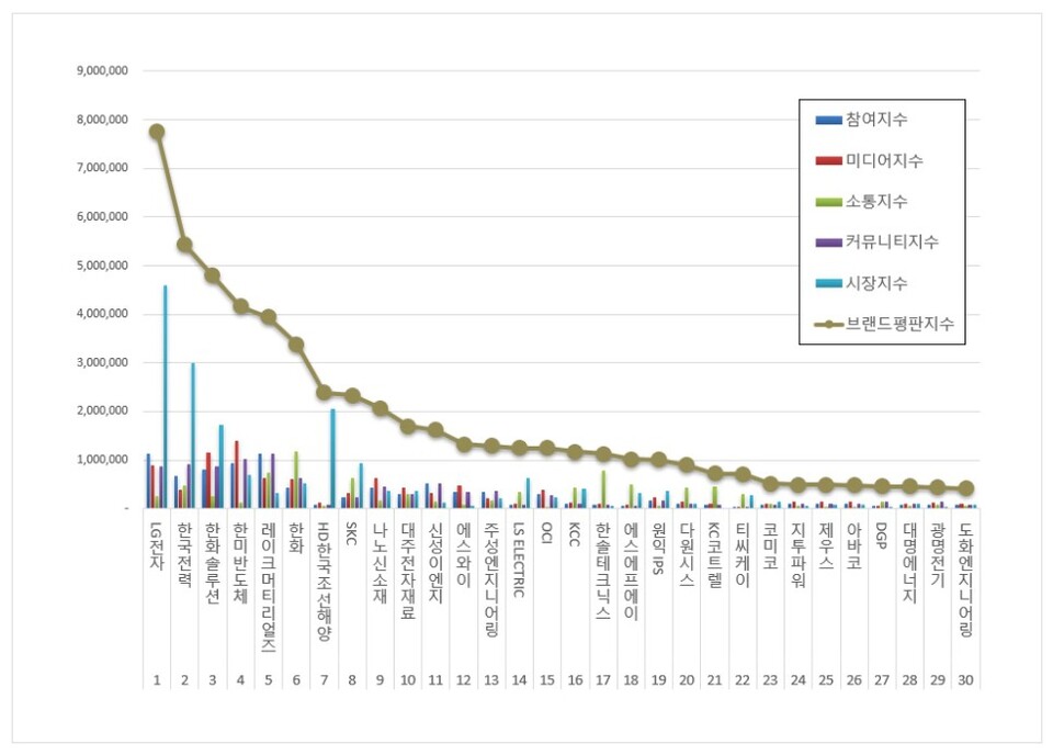 2위, 한국전력 브랜드는 참여지수 668,480 미디어지수 390,197 소통지수 480,584 커뮤니티지수 907,139 시장지수 2,988,675가 되면서 브랜드평판지수 5,435,076으로 분석됐다. 지난 6월 브랜드평판지수 5,936,065와 비교해보면 8.44% 하락했다.