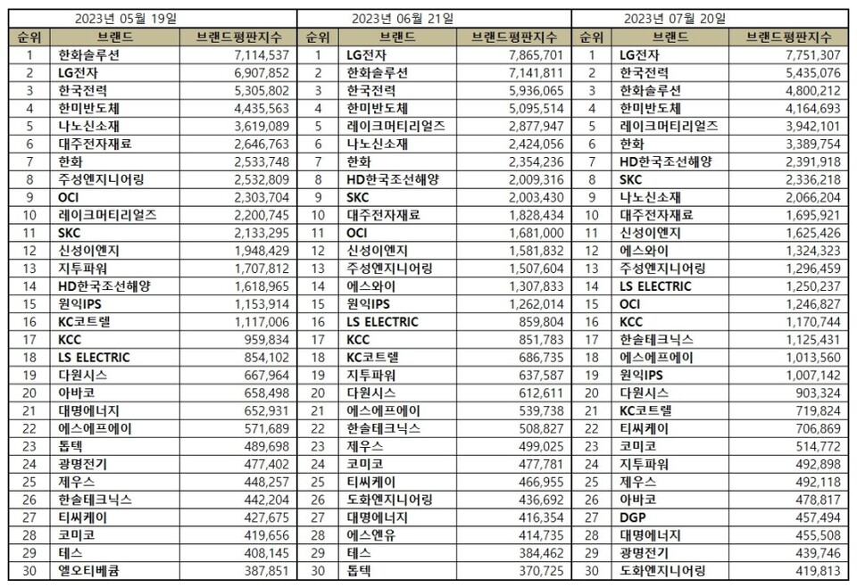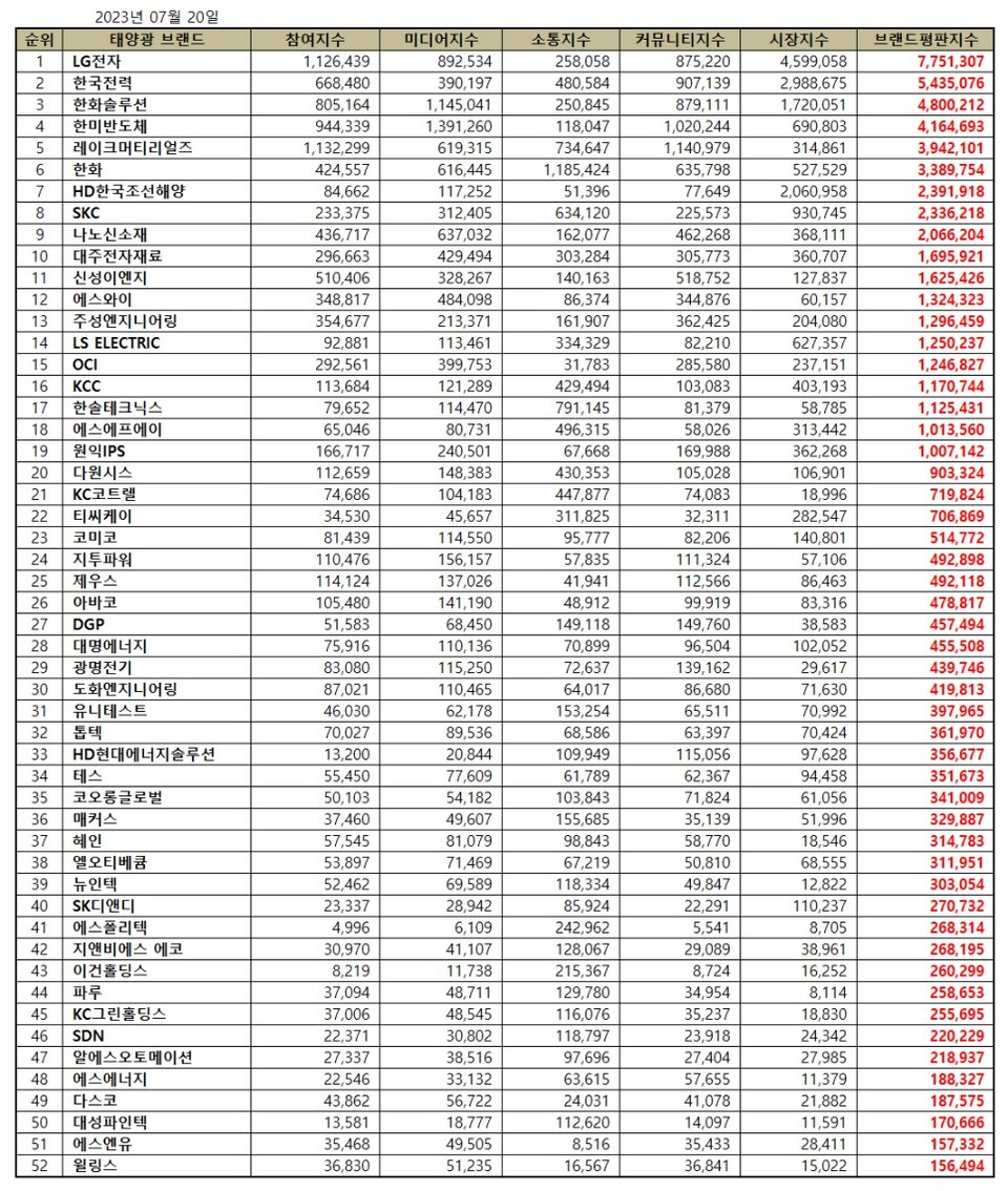 이넷뉴스 에너지 톱 브랜드위원회는 20일 태양광에너지 관련 상장기업 ‘2023년 7월 빅데이터 분석결과’를 발표했다. 발표에 따르면, 1위 LG전자 2위 한국전력 3위 한화솔루션 순으로 나타났다.