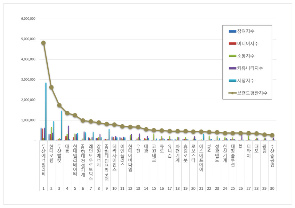 기계 상장기업 브랜드평판 1위를 기록한 두산에너빌리티 브랜드는 참여지수 636,960 미디어지수 584,317 소통지수 127,999 커뮤니티지수 624,146 시장지수 2,847,260이 되면서 브랜드평판지수 4,820,682로 분석됐다. 지난 6월 브랜드평판지수 4,750,214와 비교해보면 1.48% 상승했다.