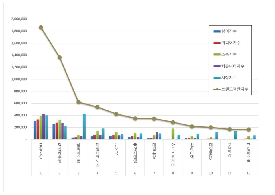 2위, 덕신하우징 브랜드는 참여지수 256,565 미디어지수 281,150 소통지수 327,586 커뮤니티지수 272,792 시장지수 224,835가 되면서 브랜드평판지수 1,362,927로 분석됐다. 지난 6월 브랜드평판지수 661,717과 비교해보면 105.97% 상승했다.