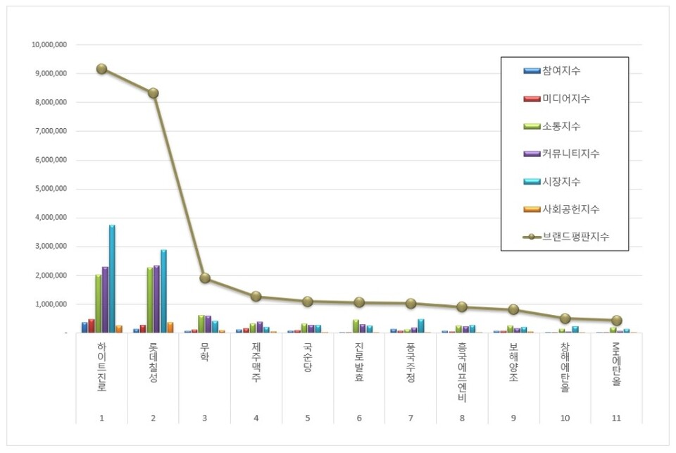 3위, 무학 브랜드는 참여지수 68,908 미디어지수 111,644 소통지수 616,759 커뮤니티지수 598,903 시장지수 418,497 사회공헌지수 91,329가 되면서 브랜드평판지수 1,906,040으로 분석됐다. 지난 6월 브랜드평판지수 1,396,382와 비교해보면 36.50% 상승했다.