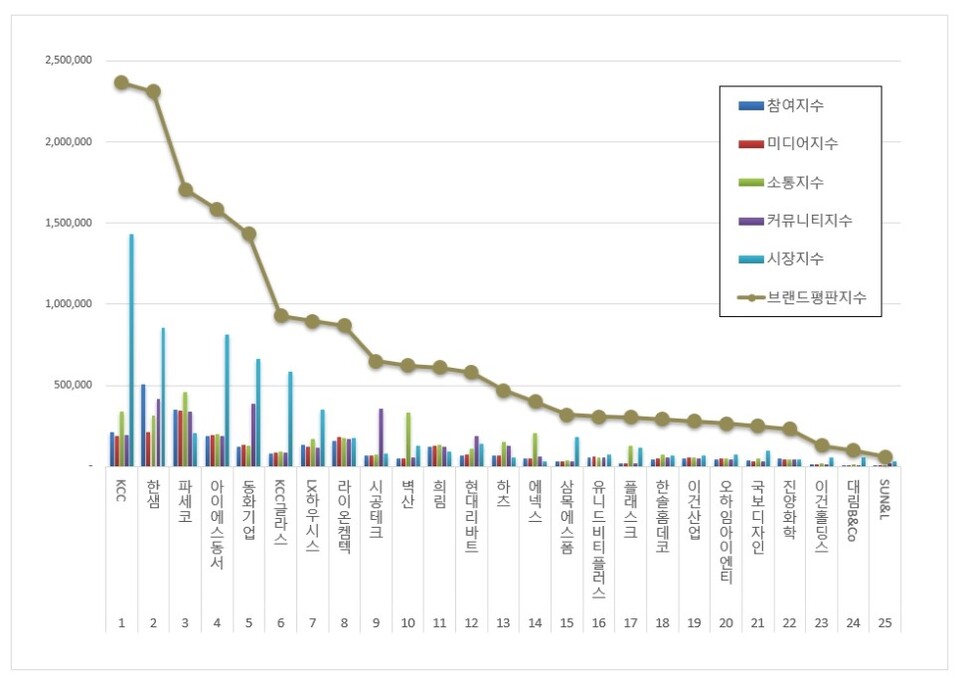 인테리어 상장기업 브랜드평판 1위를 기록한 KCC 브랜드는 참여지수 210,806 미디어지수 191,501 소통지수 336,940 커뮤니티지수 194,637 시장지수 1,431,772가 되면서 브랜드평판지수 2,365,657로 분석됐다. 지난 6월 브랜드평판지수 2,325,107과 비교해보면 1.74% 상승했다.