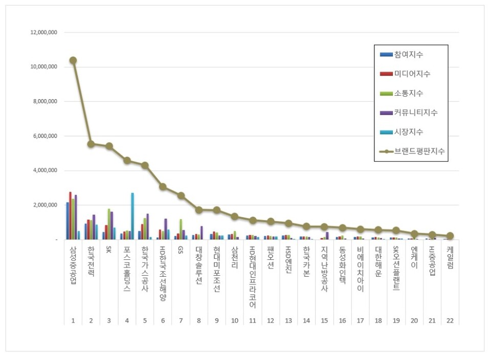 2위, 한국전력 브랜드는 참여지수 946,934 미디어지수 1,150,125 소통지수 1,129,270 커뮤니티지수 1,450,759 시장지수 867,403이 되면서 브랜드평판지수 5,544,490으로 분석됐다. 지난 6월 브랜드평판지수 2,951,329와 비교해보면 87.86% 상승했다.