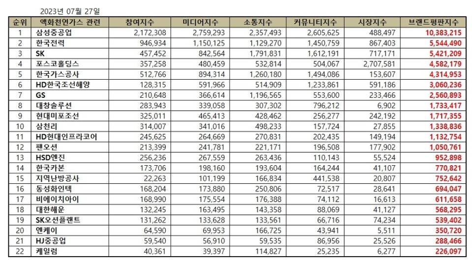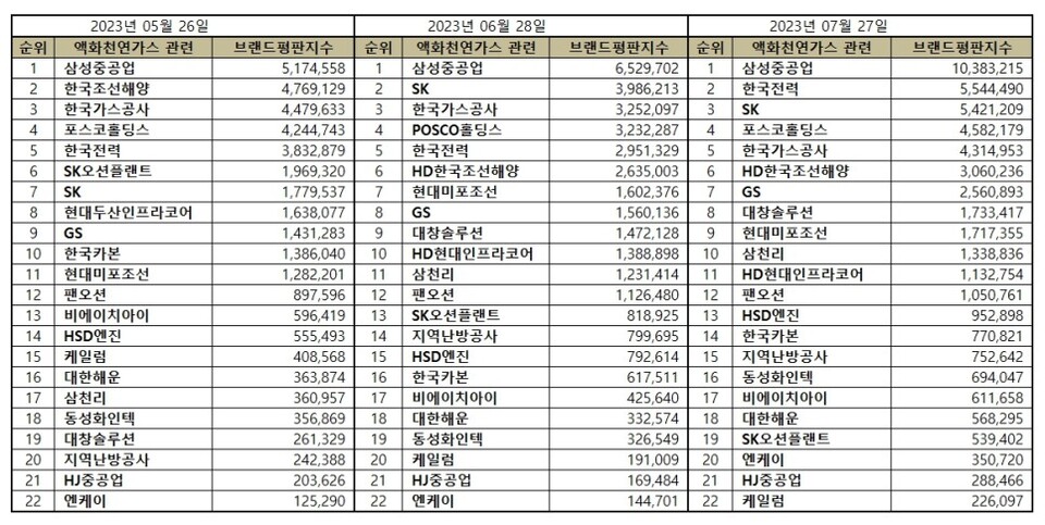 액화천연가스 LNG 관련 상장기업 브랜드평판 2023년 7월 빅데이터 분석 순위는 삼성중공업, 한국전력, SK, 포스코홀딩스, 한국가스공사, HD한국조선해양, GS, 대창솔루션, 현대미포조선, 삼천리, HD현대인프라코어, 팬오션, HSD엔진, 한국카본, 지역난방공사, 동성화인텍, 비에이치아이, 대한해운, SK오션플랜트, 엔케이, HJ중공업, 케일럼 순이었다.