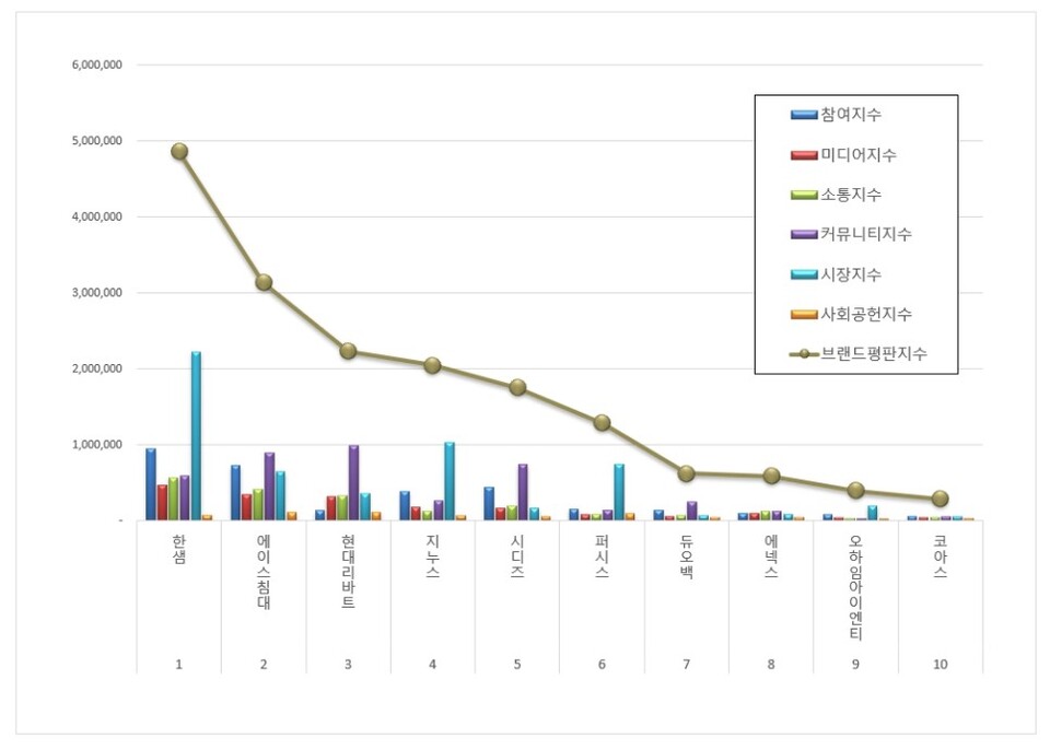 3위, 현대리바트 브랜드는 참여지수 130,854 미디어지수 320,553 소통지수 326,414 커뮤니티지수 983,788 시장지수 354,239 사회공헌지수 111,438이 되면서 브랜드평판지수 2,227,286으로 분석됐다. 지난 6월 브랜드평판지수 1,684,128과 비교해보면 32.25% 상승했다.