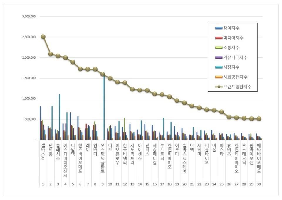 2위, 덴티움 브랜드는 참여지수 332,605 미디어지수 284,561 소통지수 299,343 커뮤니티지수 263,021 시장지수 827,348 사회공헌지수 84,152가 되면서 브랜드평판지수 2,091,030으로 분석됐다. 지난 6월 브랜드평판지수 1,947,329와 비교해보면 7.38% 상승했다.