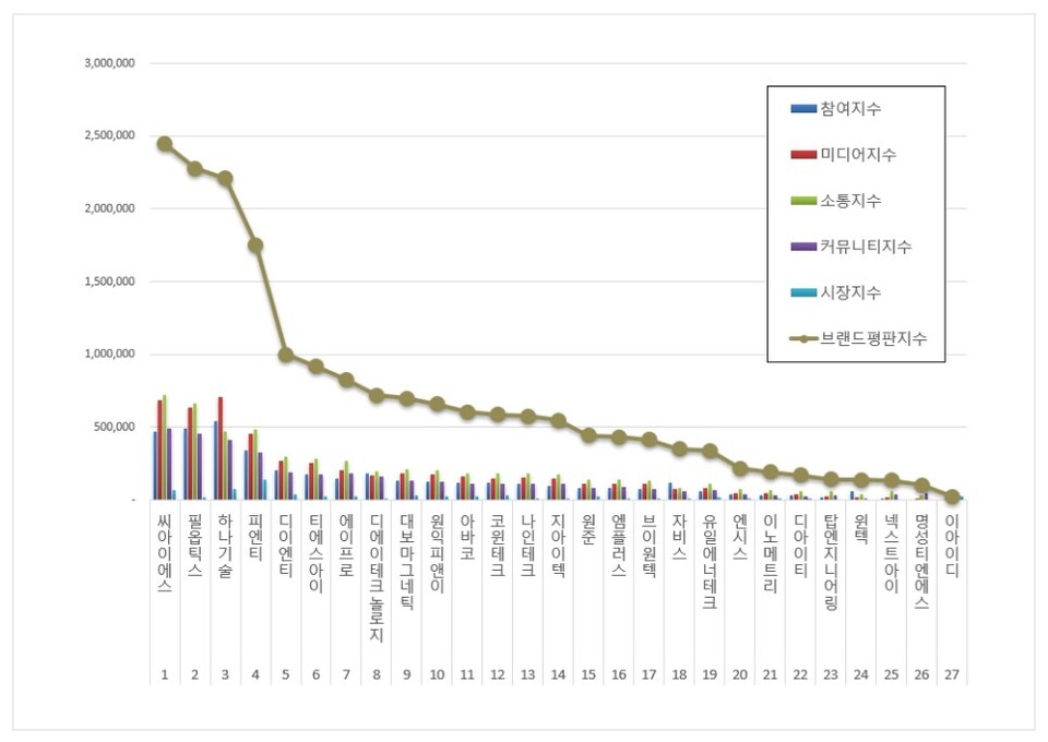 1위, 씨아이에스 브랜드는 참여지수 470,118 미디어지수 689,589 소통지수 721,531 커뮤니티지수 491,903 시장지수 71,538이 되면서 브랜드평판지수 2,444,679로 분석됐다. 지난 6월 브랜드평판지수 1,834,979와 비교해보면 33.23% 상승했다.