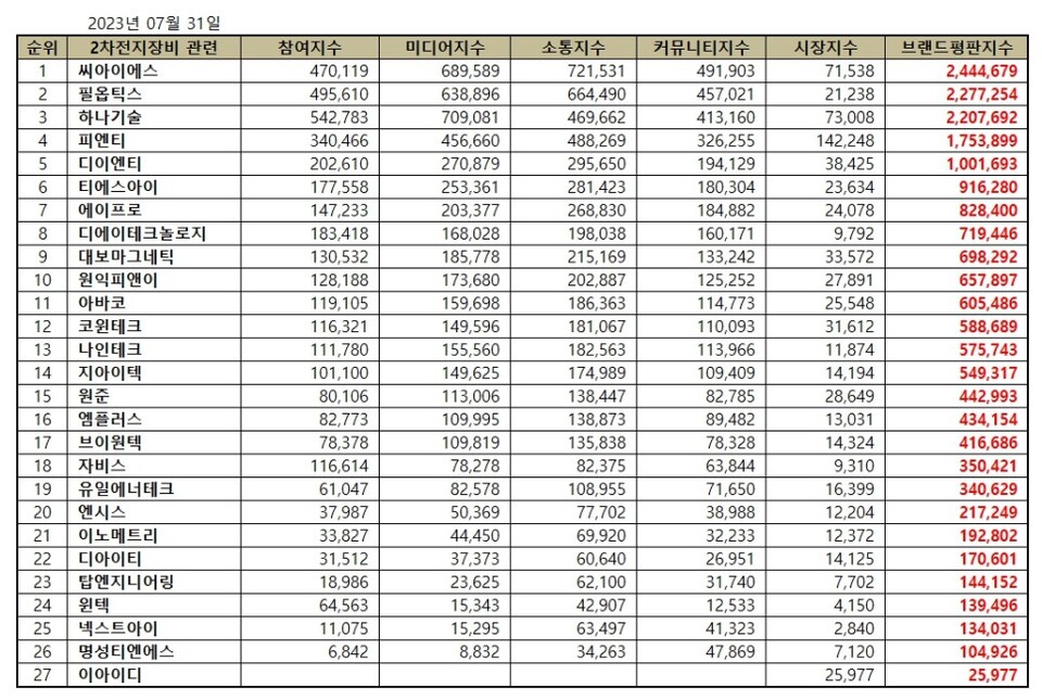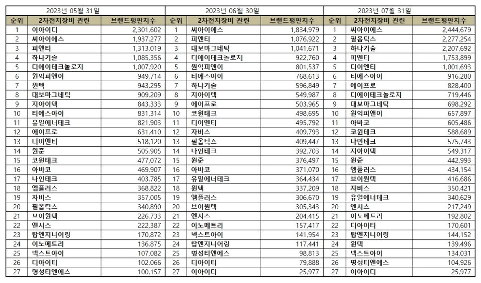 이넷뉴스 = 2차전지장비 관련 상장기업 2023년 7월 브랜드평판이 공개됐다.