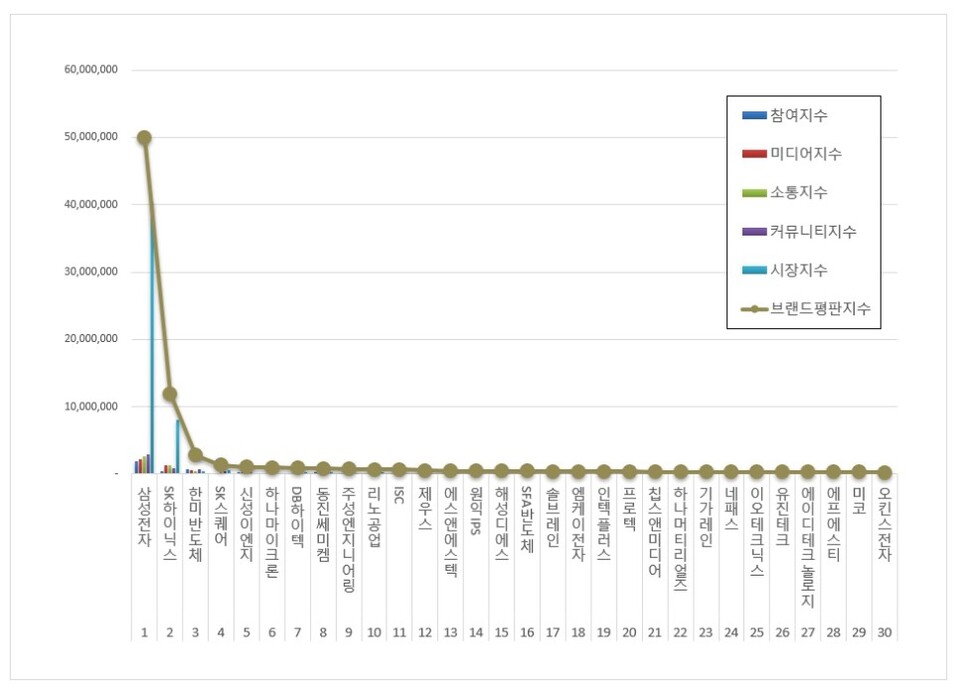 2위, SK하이닉스 브랜드는 참여지수 440,148 미디어지수 1,260,252 소통지수 1,360,918 커뮤니티지수 884,632 시장지수 7,971,559가 되면서 브랜드평판지수 11,917,509로 분석됐다. 지난 7월 브랜드평판지수 10,679,777과 비교해보면 11.59% 상승했다.