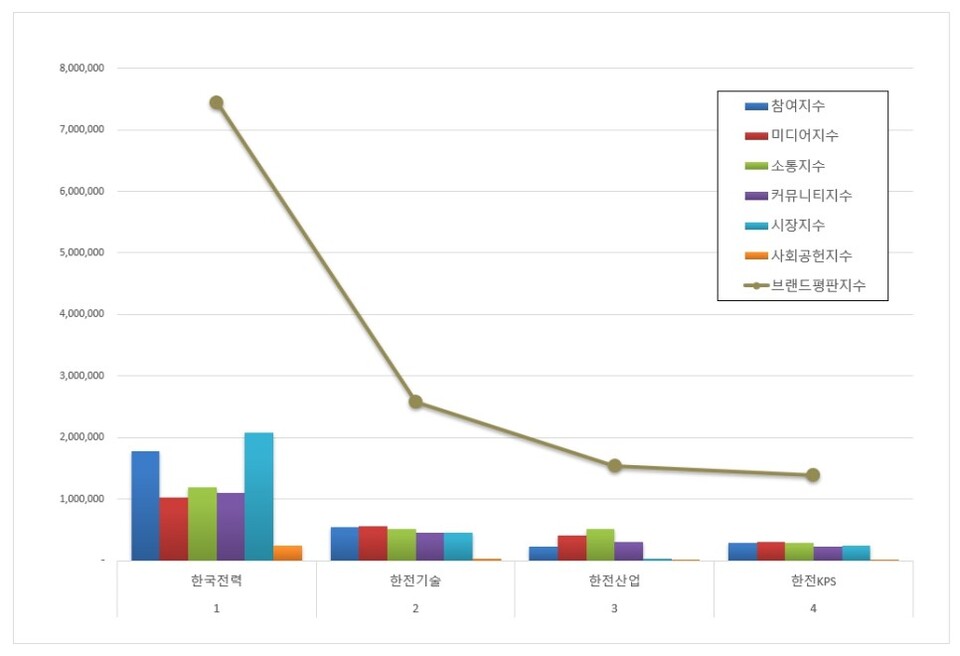 1위, 한국전력 브랜드는 참여지수 1,787,144 미디어지수 1,021,924 소통지수 1,201,566 커뮤니티지수 1,104,763 시장지수 2,085,048 사회공헌지수 246,053이 되면서 브랜드평판지수 7,446,497로 분석됐다. 지난 7월 브랜드평판지수 7,066,380과 비교해보면 5.38% 상승했다.