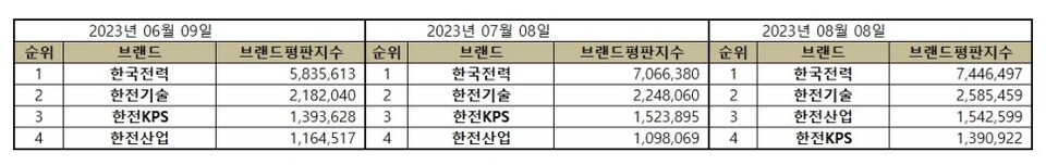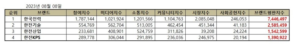 2023년 8월 전기 유틸리티 상장기업 브랜드평판 순위는 한국전력, 한전기술, 한전산업, 한전KPS 순으로 분석됐다.