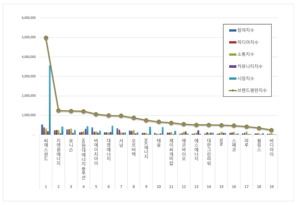 1위, 씨에스윈드 브랜드는 참여지수 523,660 미디어지수 384,527 소통지수 314,684 커뮤니티지수 194,846 시장지수 3,556,410이 되면서 브랜드평판지수 4,974,127로 분석됐다. 지난 7월 브랜드평판지수 6,420,849와 비교해보면 22.53% 하락했다.