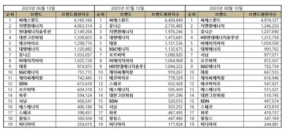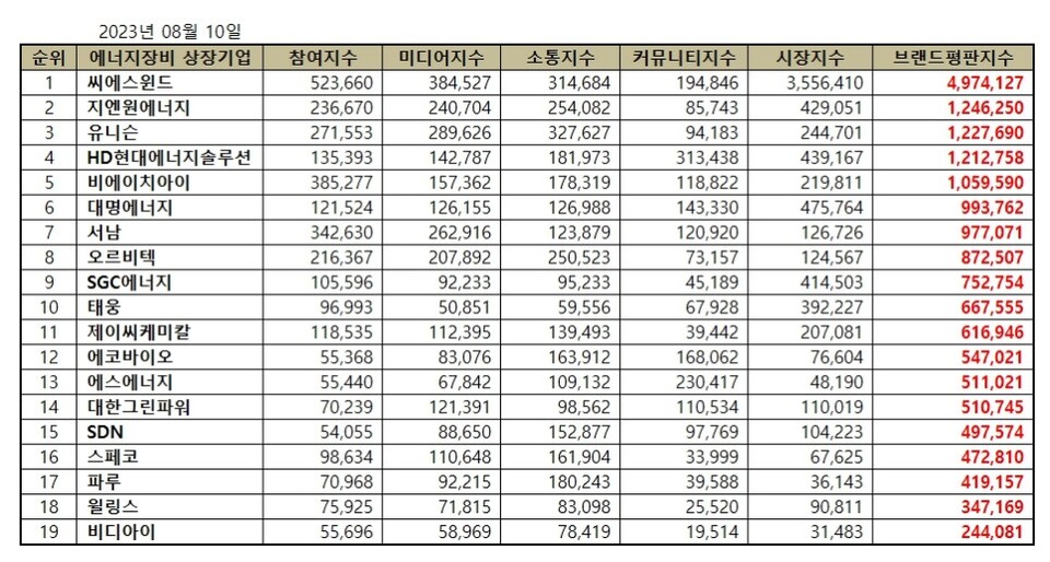 2023년 8월 에너지장비 상장기업 브랜드평판 빅데이터 분석 순위는 씨에스윈드, 지엔원에너지, 유니슨, HD현대에너지솔루션, 비에이치아이, 대명에너지, 서남, 오르비텍, SGC에너지, 태웅, 제이씨케미칼, 에코바이오, 에스에너지, 대한그린파워, SDN, 스페코, 파루, 윌링스, 비디아이 순이었다.