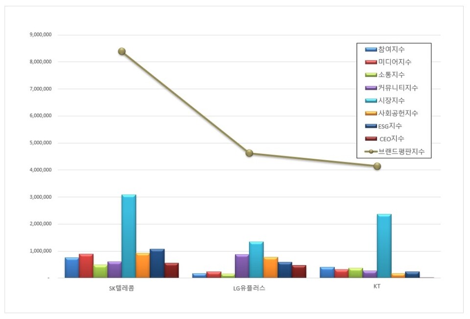 2위, LG유플러스 브랜드는 참여지수 173,764 미디어지수 232,479 소통지수 163,542 커뮤니티지수 869,491 시장지수 1,339,820 사회공헌지수 774,783 ESG지수 594,930 CEO지수 471,562가 되면서 브랜드평판지수 4,620,372로 분석됐다. 지난 7월 브랜드평판지수 4,671,937과 비교해보면 1.10% 하락했다.