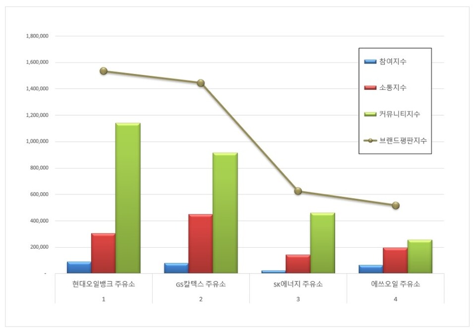 1위, 현대오일뱅크 주유소 브랜드는 참여지수 90,504 소통지수 306,012 커뮤니티지수 1,139,030이 되면서 브랜드평판지수 1,535,545로 분석됐다. 지난 7월 브랜드평판지수 1,474,441과 비교해보면 4.14% 상승했다.