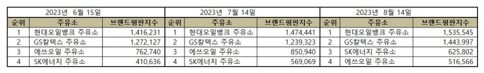 2023년 8월 주유소 브랜드평판 순위는 현대오일뱅크 주유소, GS칼텍스 주유소, SK에너지 주유소, 에쓰오일 주유소 순으로 분석됐다.