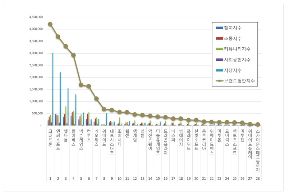 게임 상장기업 브랜드평판 1위를 기록한 크래프톤 브랜드는 참여지수 243,212 소통지수 372,095 커뮤니티지수 429,854 사회공헌지수 125,722 시장지수 3,029,985가 되면서 브랜드평판지수 4,200,867로 분석됐다. 지난 7월 브랜드평판지수 4,541,813과 비교해보면 7.51% 하락했다.