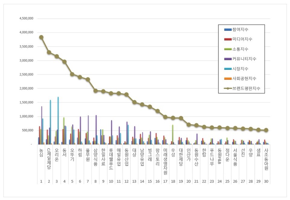 식품 상장기업 브랜드평판 1위를 기록한 농심 브랜드는 참여지수 262,171 미디어지수 650,724 소통지수 555,408 커뮤니티지수 1,371,659 시장지수 924,988 사회공헌지수 71,952가 되면서 브랜드평판지수 3,836,902로 분석됐다. 지난 7월 브랜드평판지수 3,517,610과 비교해보면 9.08% 상승했다.
