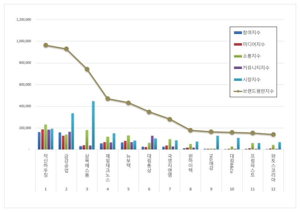건축제품 상장기업 브랜드평판 1위를 기록한 덕신하우징 브랜드는 참여지수 162,826 미디어지수 188,482 소통지수 232,265 커뮤니티지수 185,535 시장지수 194,624가 되면서 브랜드평판지수 963,732로 분석됐다. 지난 7월 브랜드평판지수 1,362,927과 비교해보면 29.29% 하락했다.