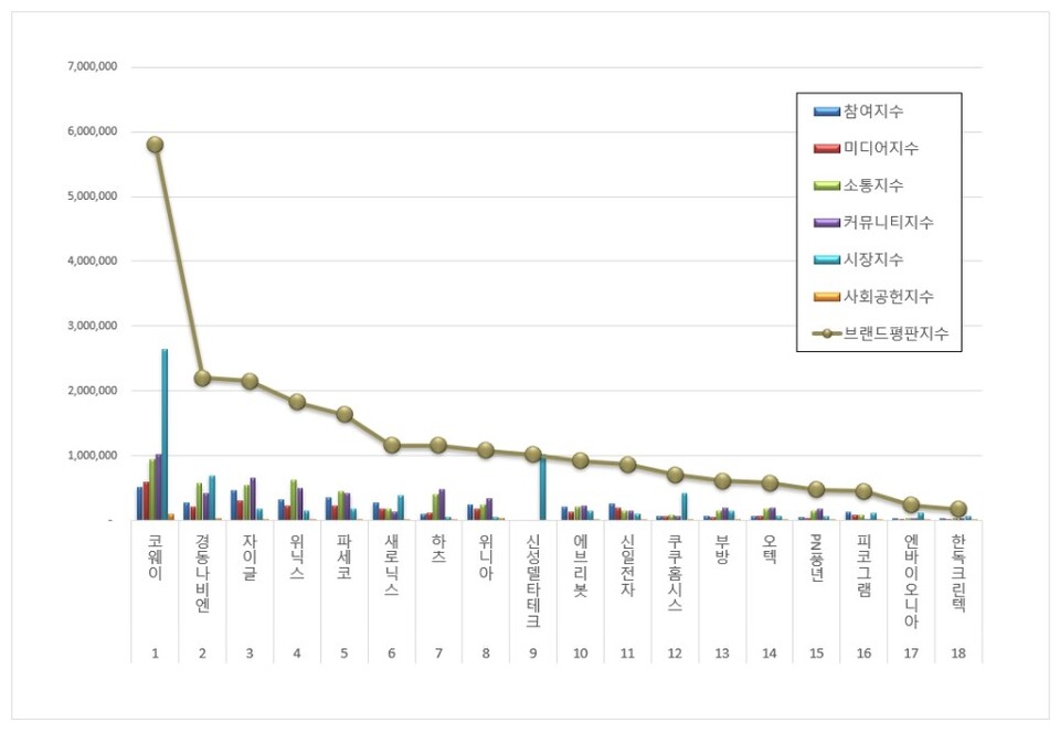 가정용품 상장기업 브랜드평판 1위를 기록한 코웨이 브랜드는 참여지수 517,806 미디어지수 589,241 소통지수 939,801 커뮤니티지수 1,022,162 시장지수 2,639,574 사회공헌지수 97,335가 되면서 브랜드평판지수 5,805,919로 분석됐다. 지난 7월 브랜드평판지수 6,561,343과 비교해보면 11.51% 하락했다.