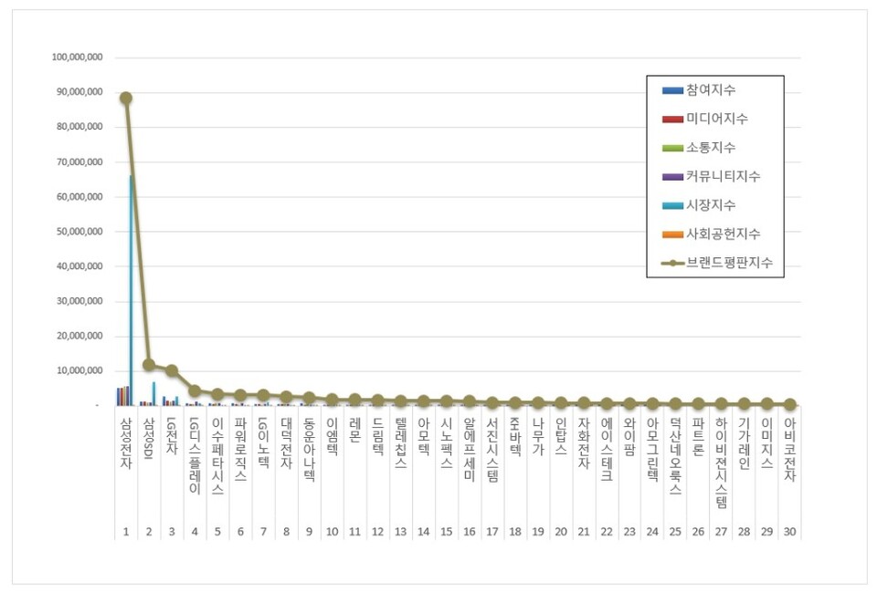 3위, LG전자 브랜드는 참여지수 2,753,798 미디어지수 1,628,793 소통지수 1,314,535 커뮤니티지수 1,587,584 시장지수 2,690,277 사회공헌지수 332,044가 되면서 브랜드평판지수 10,307,031로 분석됐다. 지난 8월 브랜드평판지수 14,203,627과 비교해보면 27.43% 하락했다.