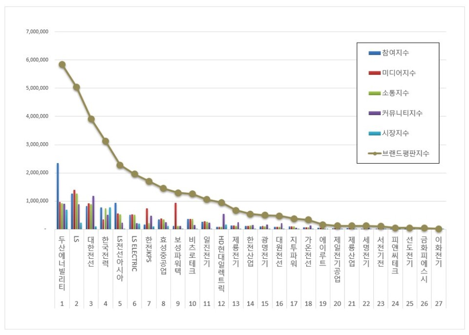 전력설비 상장기업 브랜드평판 1위를 기록한 두산에너빌리티 브랜드는 참여지수 2,348,372 미디어지수 967,911 소통지수 923,563 커뮤니티지수 911,404 시장지수 698,374가 되면서 브랜드평판지수 5,849,623으로 분석됐다. 지난 8월 브랜드평판지수 6,720,957과 비교해보면 12.96% 하락했다.