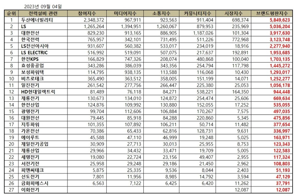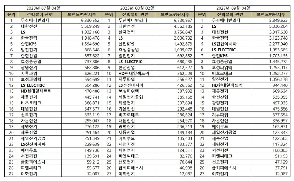 전력설비 상장기업 브랜드평판 2023년 9월 빅데이터 분석 순위는 두산에너빌리티, LS, 대한전선, 한국전력, LS전선아시아, LS ELECTRIC, 한전KPS, 효성중공업, 보성파워텍, 비츠로테크, 일진전기, HD현대일렉트릭, 제룡전기 , 한전산업, 광명전기, 대원전선, 지투파워, 가온전선, 에이루트, 제일전기공업, 제룡산업, 세명전기, 서전기전, 피앤씨테크, 선도전기, 금화피에스시, 이화전기 순이었다.