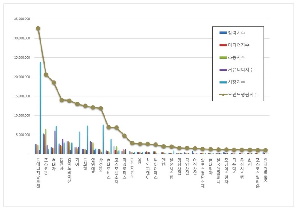 1위, LG에너지솔루션 브랜드는 참여지수 2,684,907 미디어지수 2,586,191 소통지수 2,395,381 커뮤니티지수 1,096,972 시장지수 23,835,652가 되면서 브랜드평판지수 32,599,103으로 분석됐다. 지난 8월 브랜드평판지수 37,603,724와 비교해보면 13.31% 하락했다.